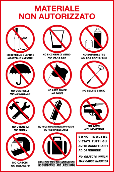 Vi invitiamo a evitare l’introduzione di eventuali oggetti pericolosi e dannosi per i partecipanti, spiegati in dettaglio nell’immagine sottostante: