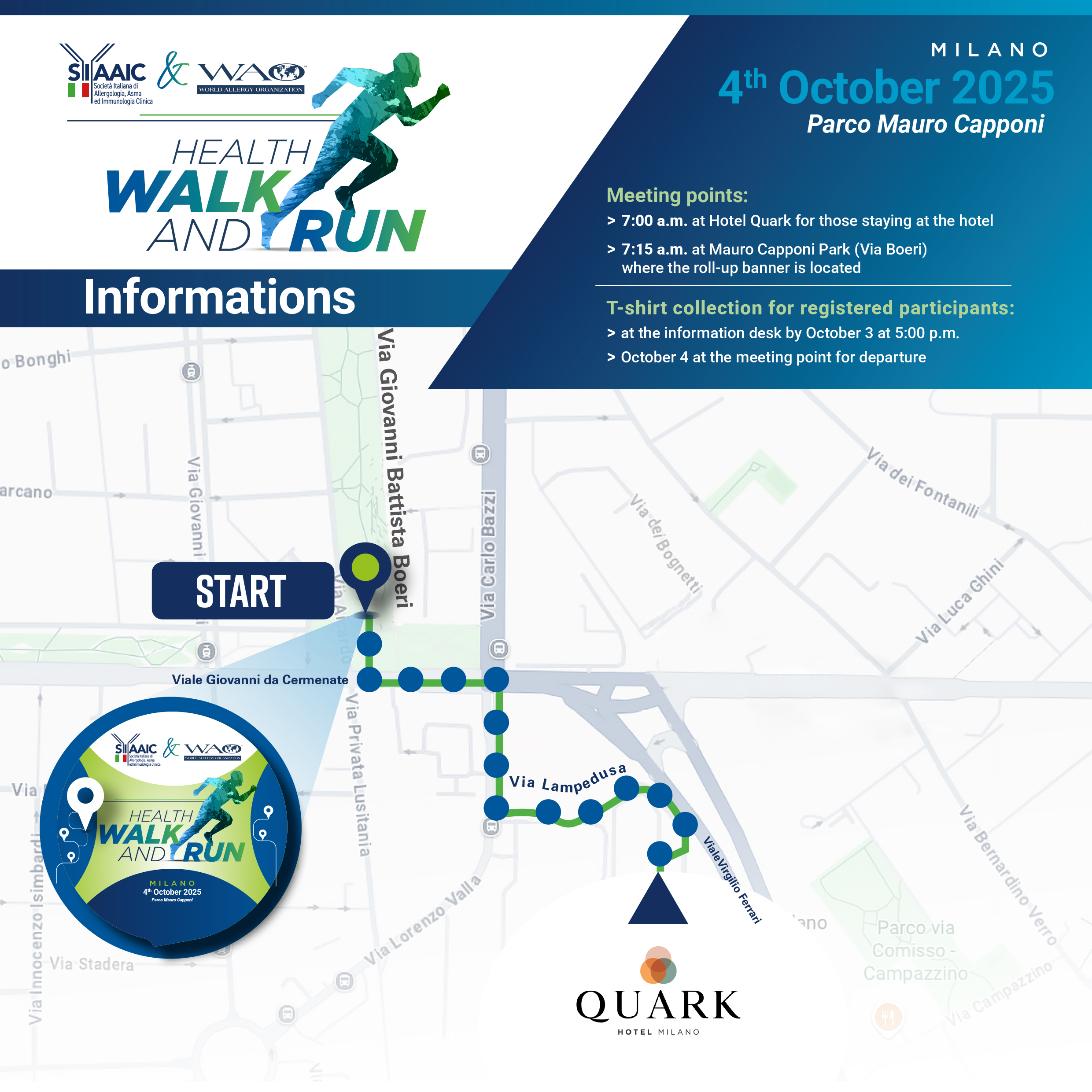 Unisciti a noi per una mattinata all’insegna della salute, dell’energia positiva, della solidarietà e del rispetto per il nostro pianeta: ti aspettiamo davanti all’ingresso del Quark Hotel (Via Lampedusa 11a – Milano) alle ore 7:00! (Fermata Metro 2 Verde: Abbiategrasso) oppure alle ore 7:15 all’ingresso del Parco Giardino Mauro Capponi – via Giovanni Battista Boeri dove sarà presente un totem SIAAIC&WAO HEALTH WALK AND RUN