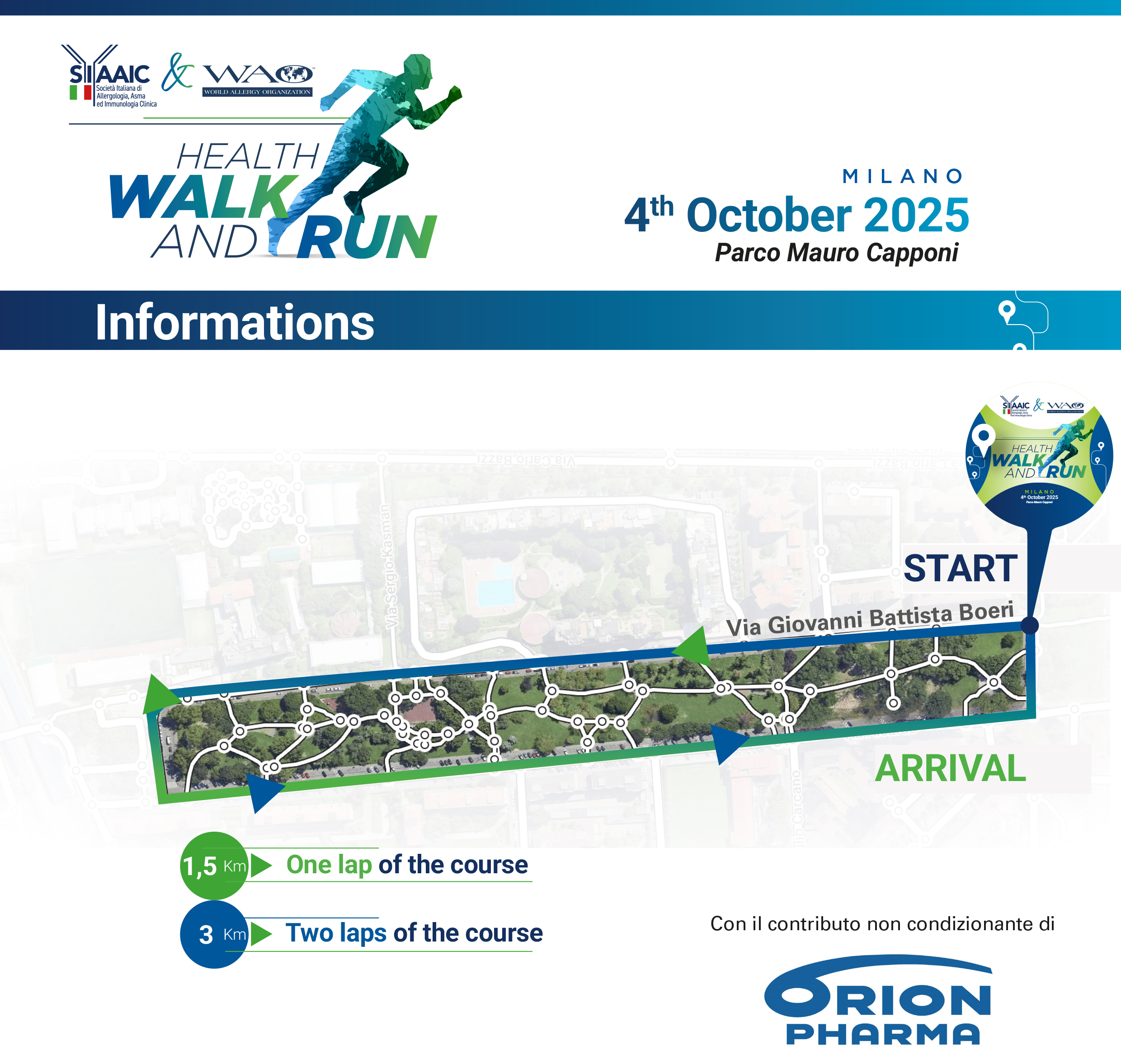 SIAAIC&WAO HEALTH WALK AND RUN si terrà il 4 Ottobre 2025, alle ore 7:00, in occasione del XXXVII Congresso Nazionale SIAAIC meets WAO, che si svolgerà a Milano. Questa iniziativa nasce con l’obiettivo di sensibilizzare il pubblico sulla stretta connessione tra salute, attività fisica e sostenibilità ambientale. Una corsa amatoriale aperta al pubblico e a tutti i partecipanti del Congresso, con l’obiettivo di promuovere un messaggio chiaro e scientificamente fondato: il benessere individuale è strettamente connesso alla salute ambientale e all’attività fisica regolare, elementi fondamentali anche nella prevenzione e gestione delle patologie allergologiche e immunologiche.